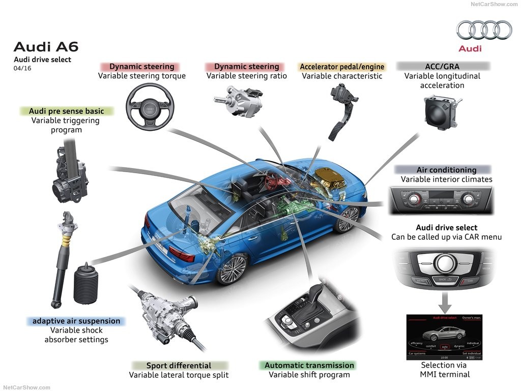 Пакет опций “Competition Package” представлен спортивной подвеской и спортивным задним дифференциалом. Высокопроизводительный Audi А6 может также оснащаться двигателем V8, улучшенными тормозами, адаптивной пневматической подвеской и 12-позиционными передними сиденьями.