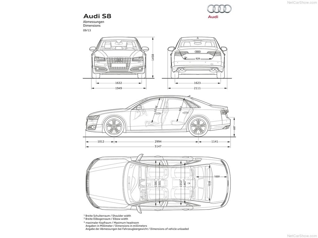 Хотя на данный момент разработчики еще не обнародовали точную информацию касательно габаритов седана, многие автомобильные эксперты считают, что размеры новинки 2018 года будут соответствовать габаритам предыдущего поколения — Audi S8 2013, но, возможно, с некоторыми отклонениями.