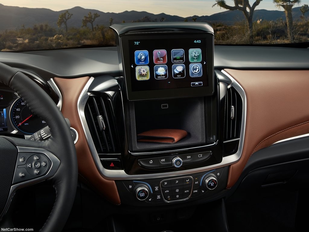 Новый интерьер Chevy Traverse может похвастаться большим ярким экраном информационно-развлекательной системы, и дополнительным цветным дисплеем между основными циферблатами на панели приборов. Передние кресла и сиденья второго ряда обеспечивают достаточно пространства для пассажиров, а третий ряд сидений без труда может разместить троих.