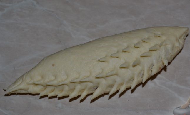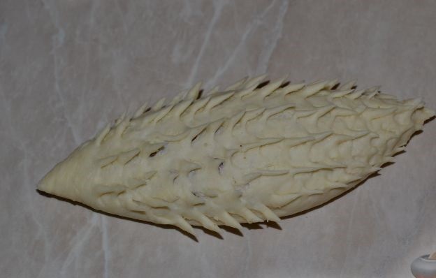 - После этого, получившиеся шишки нужно смазать желтком и аккуратно, с помощью маникюрных ножниц, сделать небольшие надрезы – лепестки шишек. Главное, не порвать тесто и не достать до начинки.