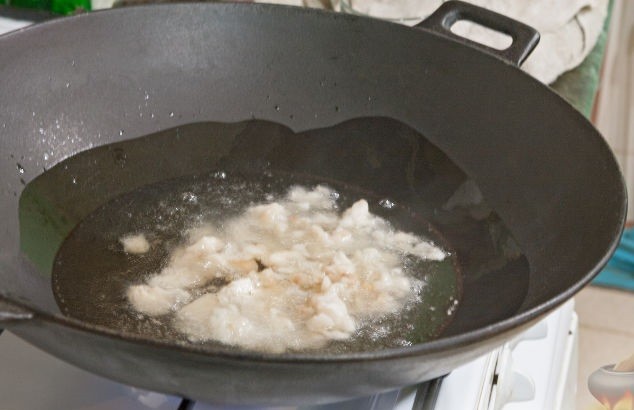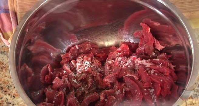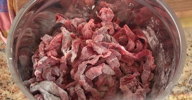 - Шаг 1. Мясо необходимо промыть, высушить на бумажном полотенце и нарезать небольшими полосками, примерно по 7 сантиметров в длину и толщиной 3 сантиметра. Добавить 70 грамм муки, посолить, добавить специи по вкусу и оставить на 10-15 минут, чтобы дать «пропитаться».