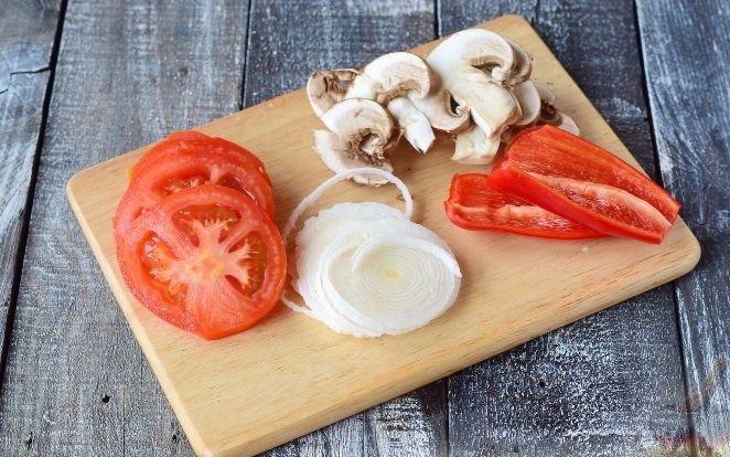- Приступаем к подготовке овощей: лук порезать кольцами, шампиньоны и помидоры нарезать пластинками, толщиной примерно 5 мм. Болгарский перец сначала разрезать пополам, потом вдоль, чтобы получились сравнительно широкие полоски.