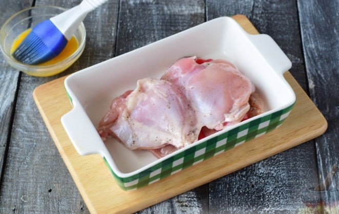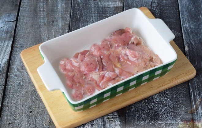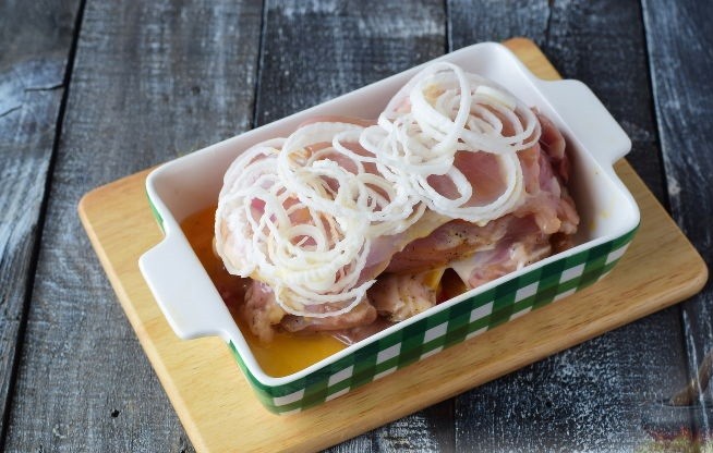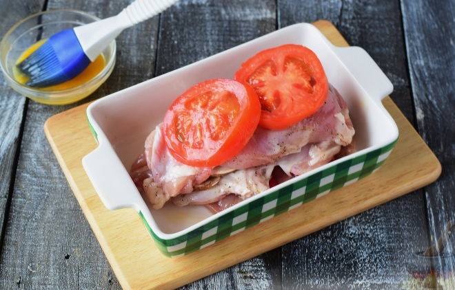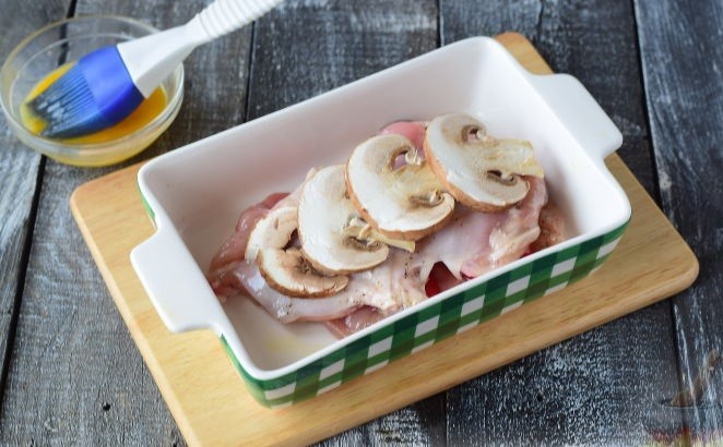 - Куриные отбивные разрезать так, чтобы в итоге получилось 4 кусочка мяса примерно одинакового размера. Дно формы для запекания необходимо немного смазать маслом и выложить продукты следующим образом: