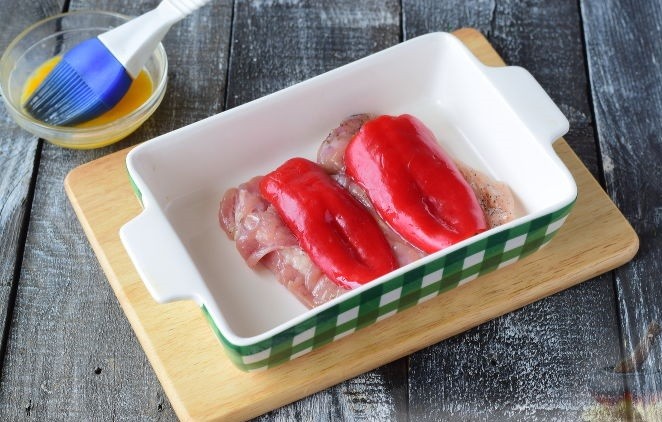 — Куриное филе (смазать яйцом).