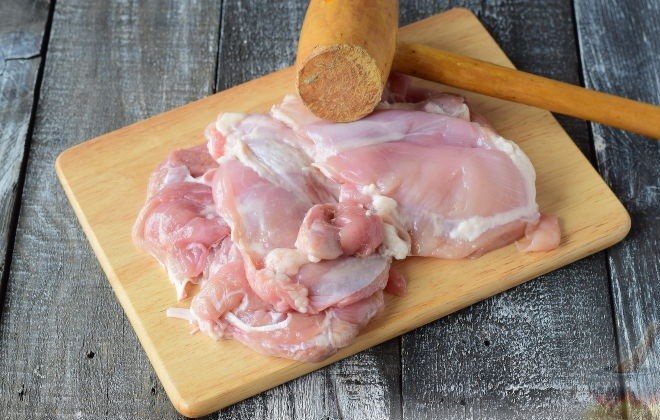 - Куриное филе отбить с обеих сторон. Посолить, поперчить.