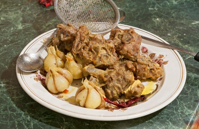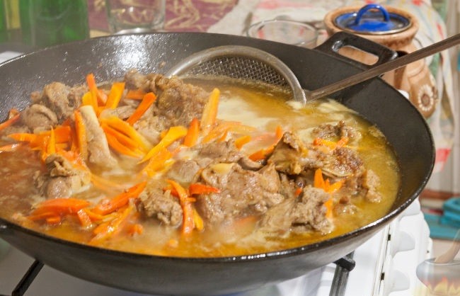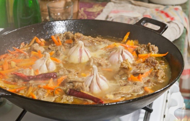 - К мясу добавить морковь и жарить до готовности примерно 10 минут. Далее залить все кипяченой водой и при закипании добавить стручки перца (перец не режем) и головки чеснока. Готовить 30 минут на медленном огне, после чего из сковороды требуется убрать кости, перец и чеснок. Посолить по вкусу.