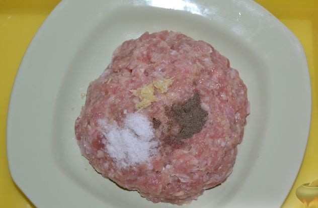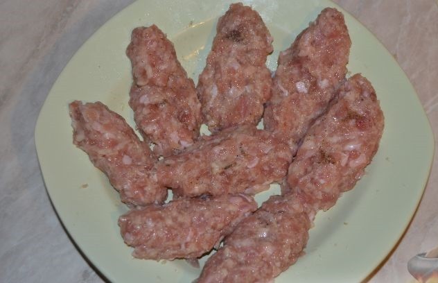 - Чтобы котлетный фарш получился не только сочным, но и вкусным, необходимо натереть небольшую луковицу на мелкой терке для получения максимального количества сока. Посолить и поперчить по вкусу. Для усиления аромата можно добавить чеснок, но это не обязательно. Из полученного фарша нужно сформировать 6-8 продолговатых котлеток.
