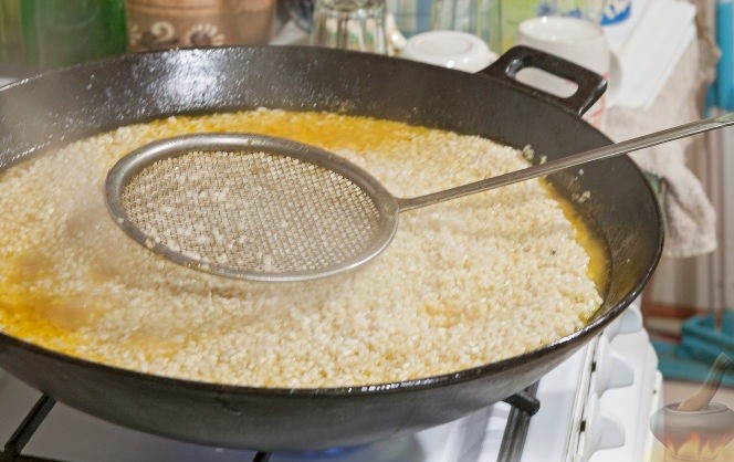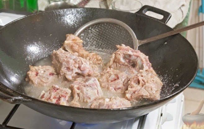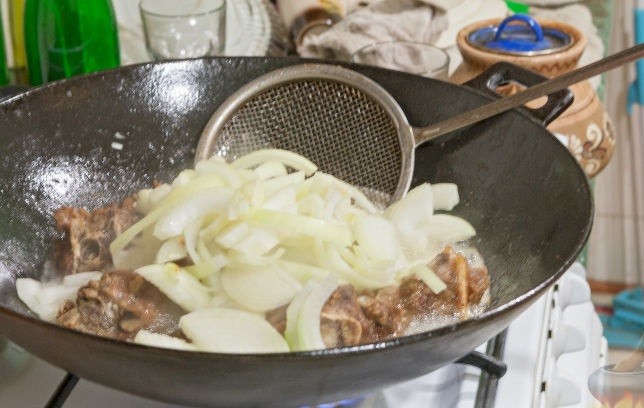 - В раскаленную глубокую сковороду (желательно вок) налить растительное масло. Поместить в нее бараньи кости, добавить специи и соль. Обжаривать 15 – 20 минут периодически переворачивая. Важно: от цвета поджаренного мяса будет зависеть цвет плова – если кости подгорят, то и плов будет с привкусом гари.