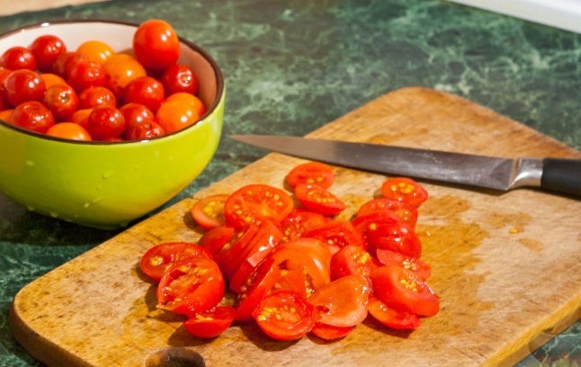 - Помидорки черри нарезать половинками. Если используете обычные помидоры, то четвертинками. Как вариант, можно использовать фигурную нарезку.