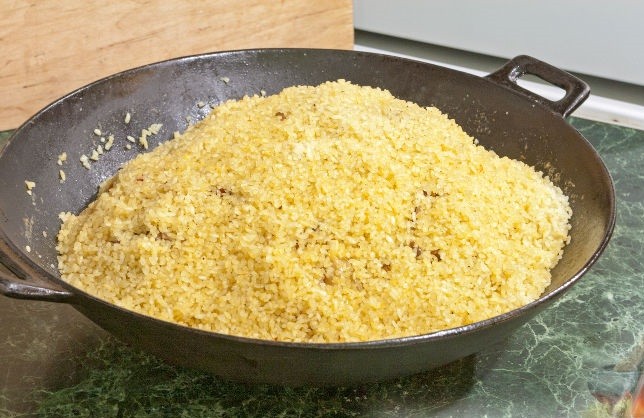 - В полученную мясную поджарку необходимы высыпать рис и выровнять его по площади сковороды, чтобы он впитал в себя как можно больше мясного бульона. Варить на среднем огне примерно 15 минут, после чего сформировать горку с углублением в центре. В нее выложить кости, перец, чеснок и барбарис, посыпать все это зирой и заложить рисом, чтобы вновь образовалась горка, но уже с ингредиентами внутри.