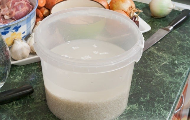 - Рис необходимо тщательного промыть до полной прозрачности. Если руководствоваться правилами восточных поваров, то пропустить его нужно через семь вод. После этого залить его горячей водой и добавить 1 столовую ложку (без верхушки) крупной соли.