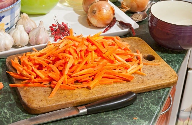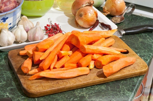 - Очистить морковь и нарезать ее длинными полосками, толщиной примерно 5 мм. Лук нарезать полукольцами. Головки чеснока избавить от лишней шелухи, но не убирать ее полностью.