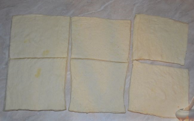 - Разморозить слоеное тесто, немного раскатать и разрезать на 6-8 квадратов (в зависимости от количества шишек). Квадрат должен иметь диагональ 10-12 см, или быть чуть меньше готовой шишки.