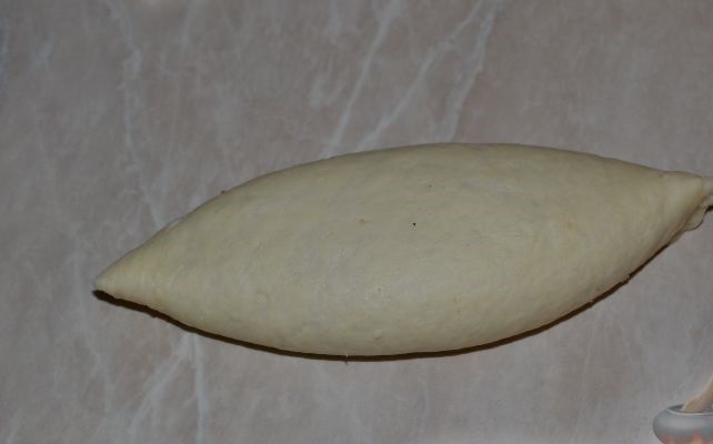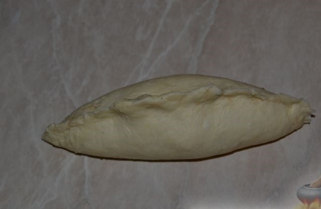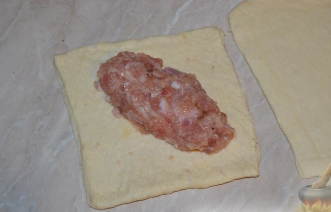 - Положить котлетку на тесто расположив ее диагонально. Защипывать как пирожок, после чего перевернуть швом вниз (если шов получается слишком толстым, лишнее тесто можно убрать).
