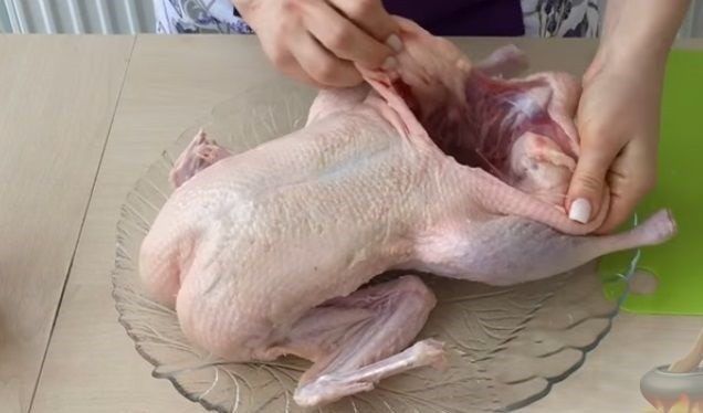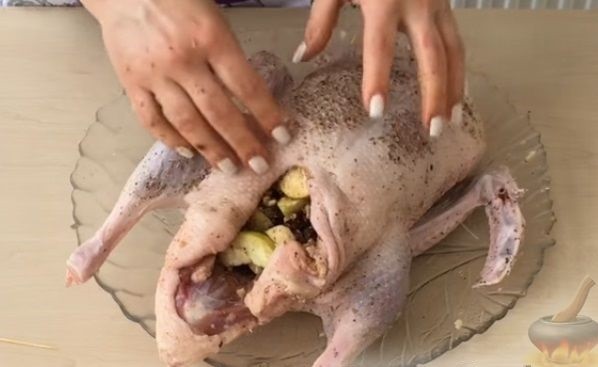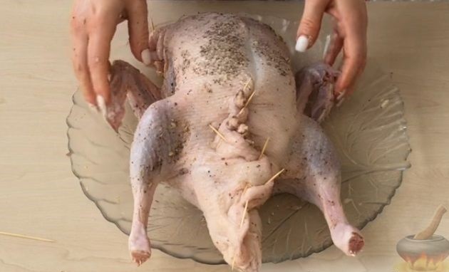 - Нафаршировать утку приготовленной начинкой, закрепить отверстия таким образом, чтобы начинка не вывалилась в процессе приготовления (можно использовать зубочистки).