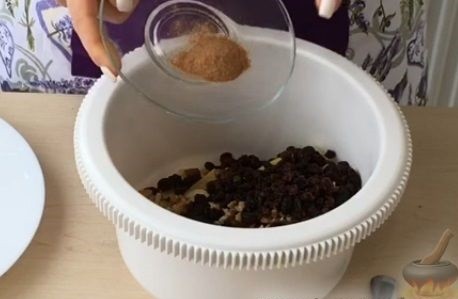 - Яблоки разрезать на 4 части, убрать сердцевину. Мелко нарубленные орехи добавить в тарелку к яблокам и изюму. Перемешать.
