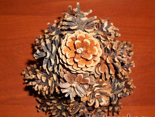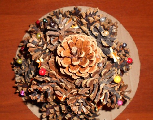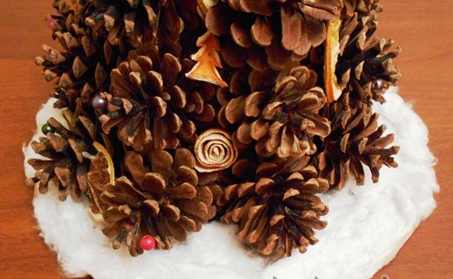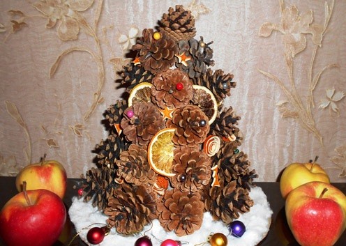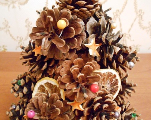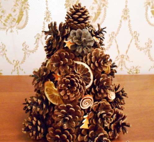 На протяжении года, совершая прогулки по лесу, обязательно запаситесь маленькими шишками. Ведь из них можно сделать очень оригинальную новогоднюю ёлочку. Так же для изготовления такой красавицы вам понадобятся засушенные дольки лимона. Так что когда вы будете пить чай, не выбрасывайте их.