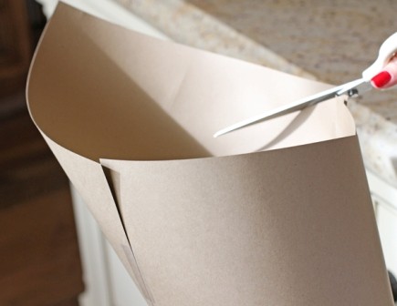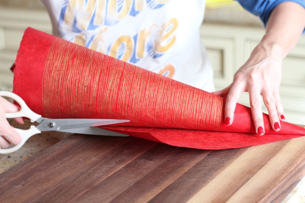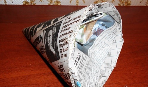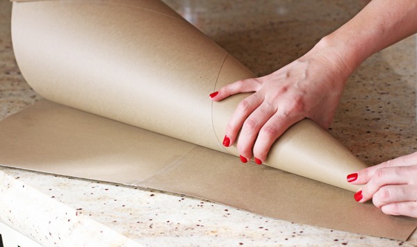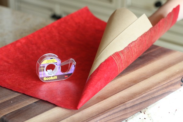 - При помощи скотча крепим упаковочную бумагу к самой верхушке нашего конуса. Затем начинаем по диагонали оборачивать ею весь конус. Обязательно следите за тем, что бы бумага ложилась как можно плотнее.