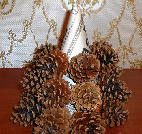 - Делаем из картона подходящий по размеру конус и закрепляем его при помощи скотча. Размер его вы можете контролировать сами. При необходимости ножницами равняем нижний край будущей елки.