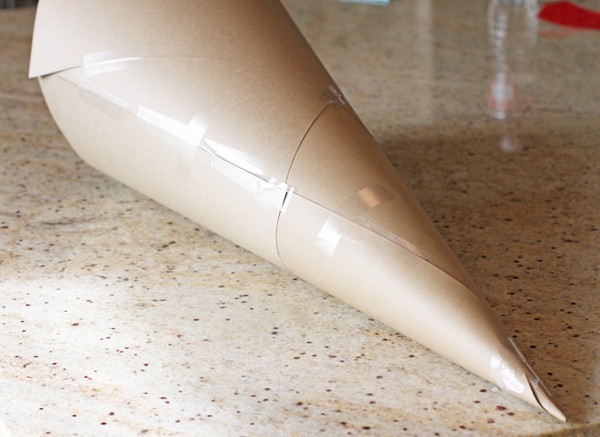 - Скручиваем конус нужного размера из приготовленного картона. Закрепляем скотчем и сверху очень плотно обматываем целлофановой плёнкой.