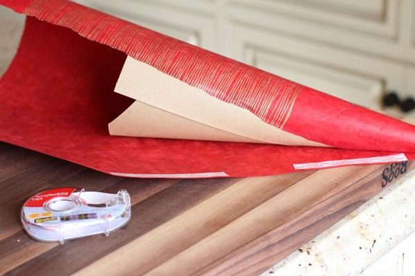 - Край бумаги закрепляем двусторонним скотчем, излишки отрезаем и всё тщательно приклеиваем.