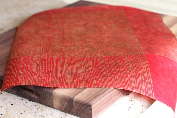 - Подарочную бумагу тщательно выравниваем на твёрдой поверхности, ведь продаётся она сильно крученная в рулон.