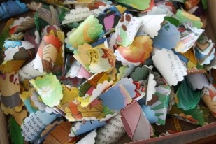- Из ярких журнальных листов вырезаем одинаковые фигурки в виде листиков, треугольников или цветочков. Какую форму выбрать решать вам, здесь нет предела вашей фантазии. Для облегчения работы, при наличии можно использовать форменный дырокол. Если же его нет, значит придётся немного потрудиться.