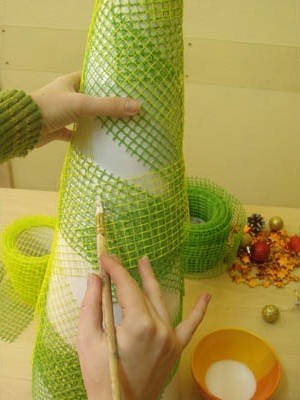 - Удаляем все булавочки и осторожно снимаем с конуса уже высохшую сетку. Отделяем её от целлофановой плёнки, поверьте это не составит особого труда.