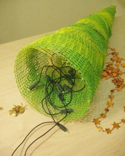 - При помощи проволочки закрепляем внутри изготовленной ёлочки нашу гирлянду.