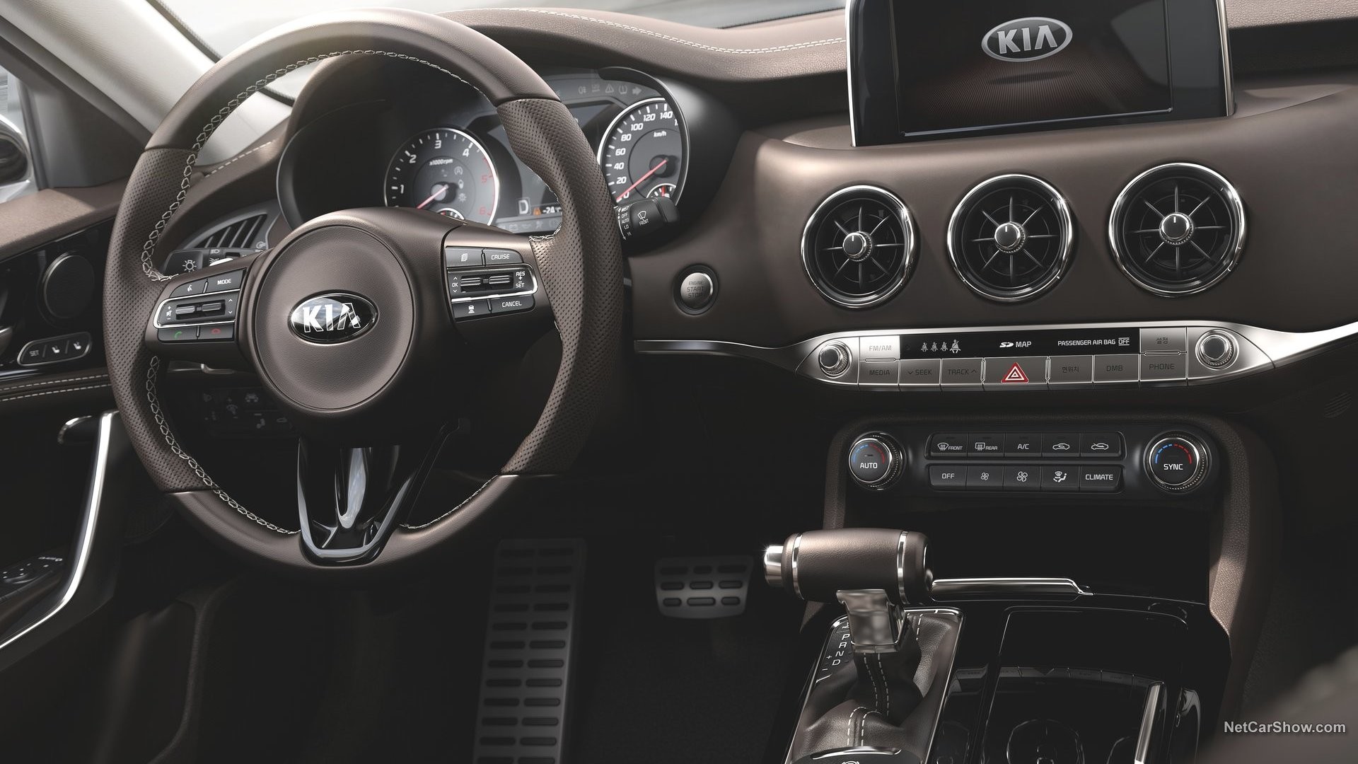 Внутреннее убранство Stinger 2018 выполнено довольно в консервативной, но в то же время элегантной манере. В салоне есть два экрана, первый размещается на высокой центральной консоли — это дисплей информационно-развлекательной системы, диагональю 8 дюймов. Второй TFT экран занял место по центру приборной панели, как раз между циферблатами приборов.