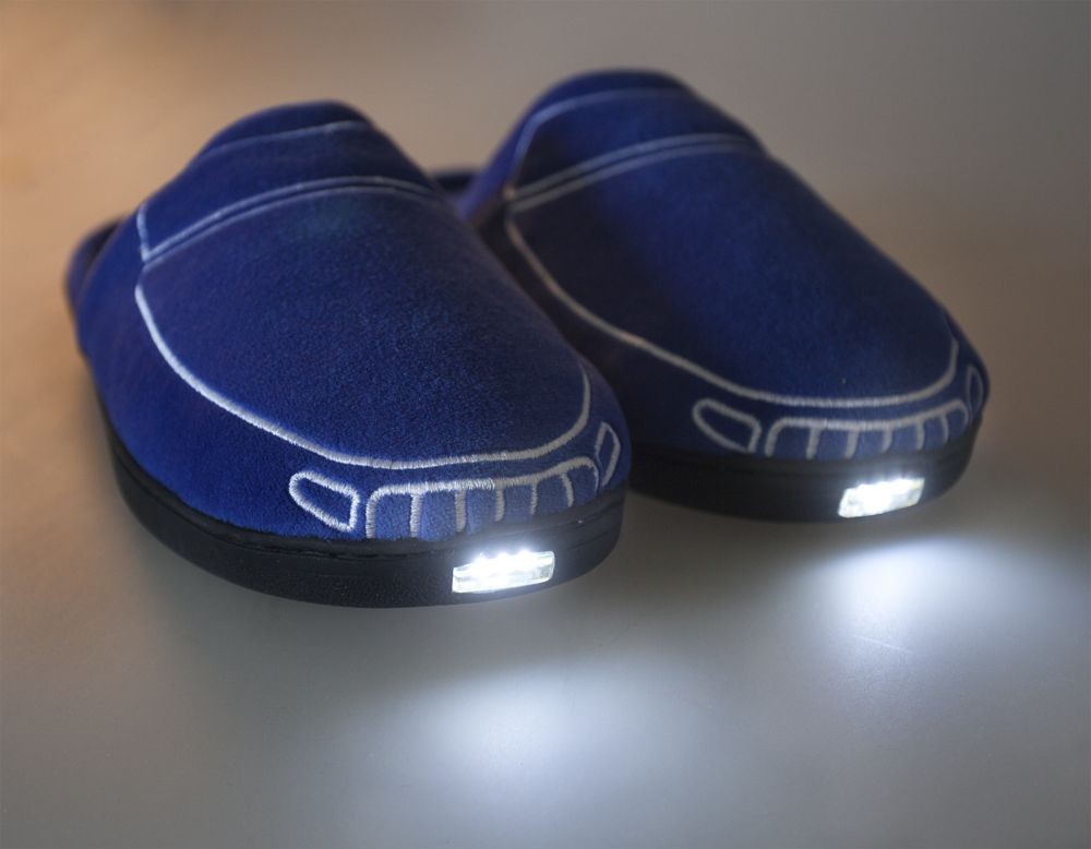 - Тапки с подсветкой. Согласно отзывам в сети, одним из оригинальных «технических» подарков являются комнатные тапочки с подсветкой. Такой подарок великолепно подойдет для невнимательных людей, которые умудряются постоянно ударяться об стулья или тумбочки. Небольшие светодиодные лампочки, вмонтированные в переднюю часть тапка будут мягко освещать все впереди стоящее, и существенно снизят риск споткнуться обо что-то, или натолкнуться на стену.
