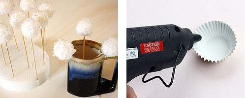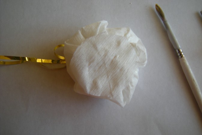 - К этому времени уже просохшие шарики начинают приклеивать к дну формы. Это лучше всего делать с помощью пистолета. С помощью него приклеиваются и веревочки, которые будут служить креплением игрушки к ветке.