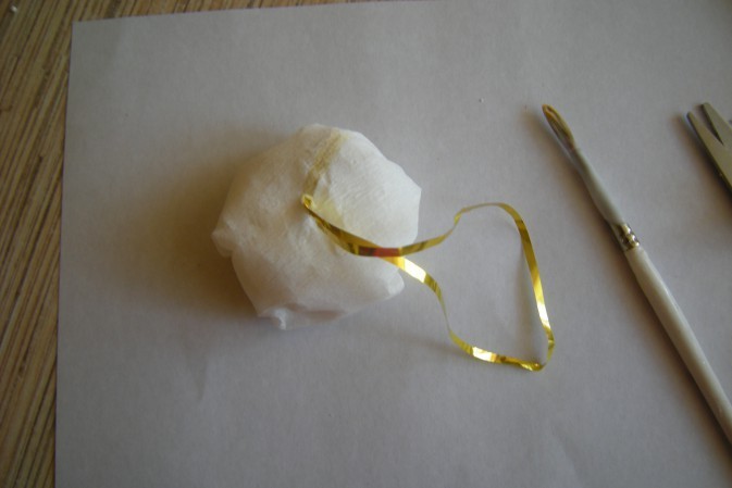 - В одном из шариков иглой делается отверстие. Туда продевается ниточка. С помощью нее «мороженое» будет висеть на елке. Если нитка не удовлетворяет эстетических предпочтений, вместо нее можно использовать ленточку. Так игрушка станет красочнее и оригинальнее.