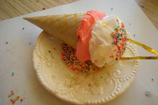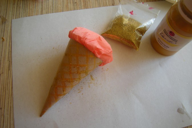 - Из картона скручиваются конусы. Это будет стаканчик для мороженого. Конусы склеиваются, чтобы не распадались.