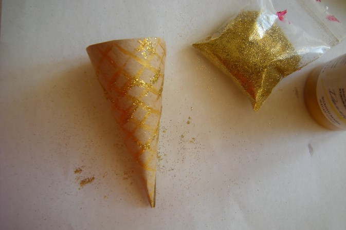 - Клеем промазывается внутренняя часть конуса, после чего туда помещаются шарики.