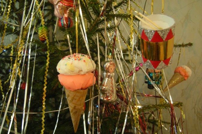 Все дети любят сладкое. Сюда можно отнести пирожное и мороженое, разнообразные торты и другие кондитерские изделия. Наверняка, им будет интересно сделать что-то подобное, но только на этот раз в качестве украшения на новогоднюю елку.