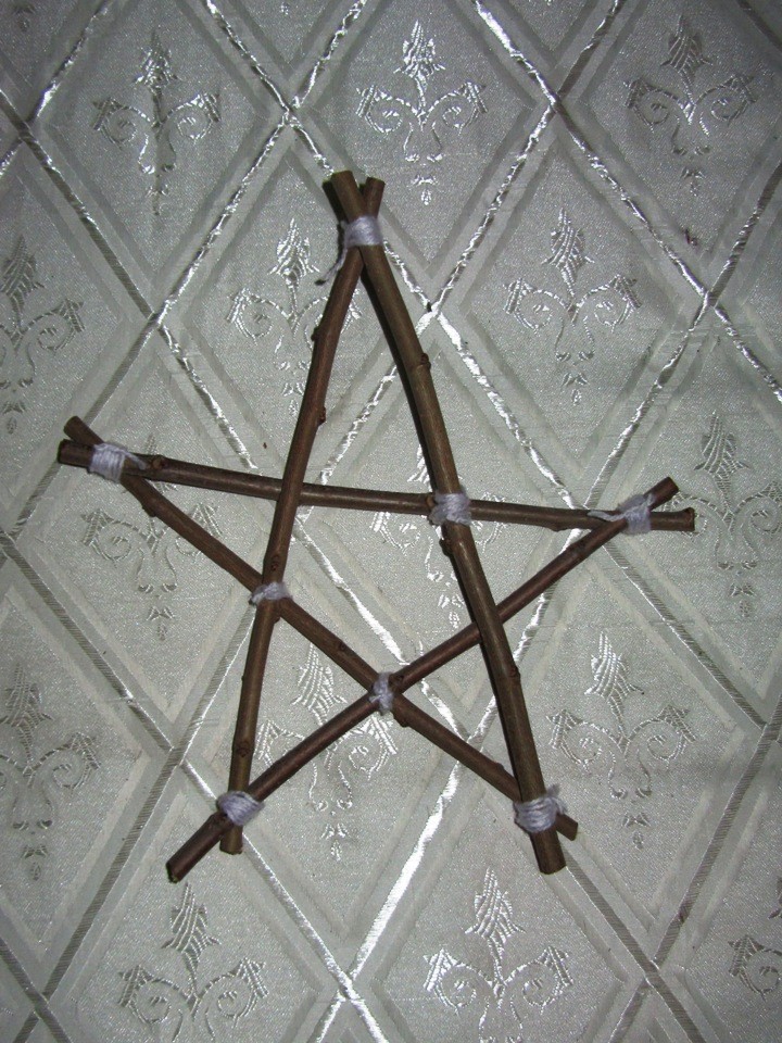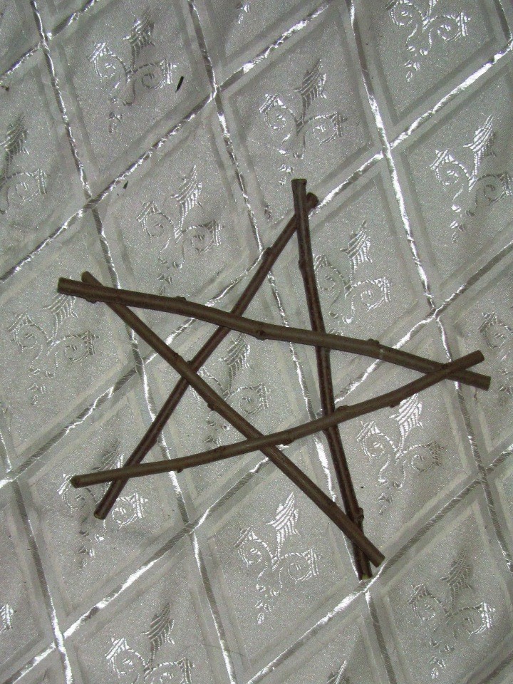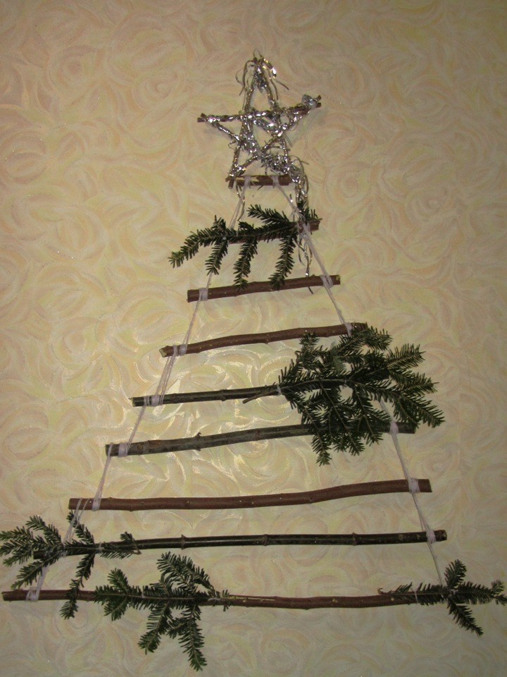 Следующая игрушка больше подойдет не столько на елку, сколько для украшения домашнего интерьера. Ее можно сделать из самого простого материала, который всегда найдется на улице, причем в больших количествах – веток с деревьев. Ее вешают на стену либо дарят в качестве презента.