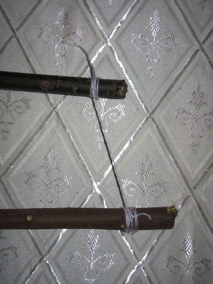 - Отрезаются два куска веревки. Они должны быть достаточно длинными, так как из них будут делаться петли до продевания каждой ветки.