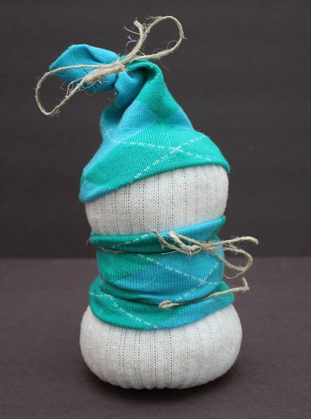 - Вторая часть носка будет служить шапкой для снеговика. В самом ее верху можно в виде бантика перевязать бечевку.
