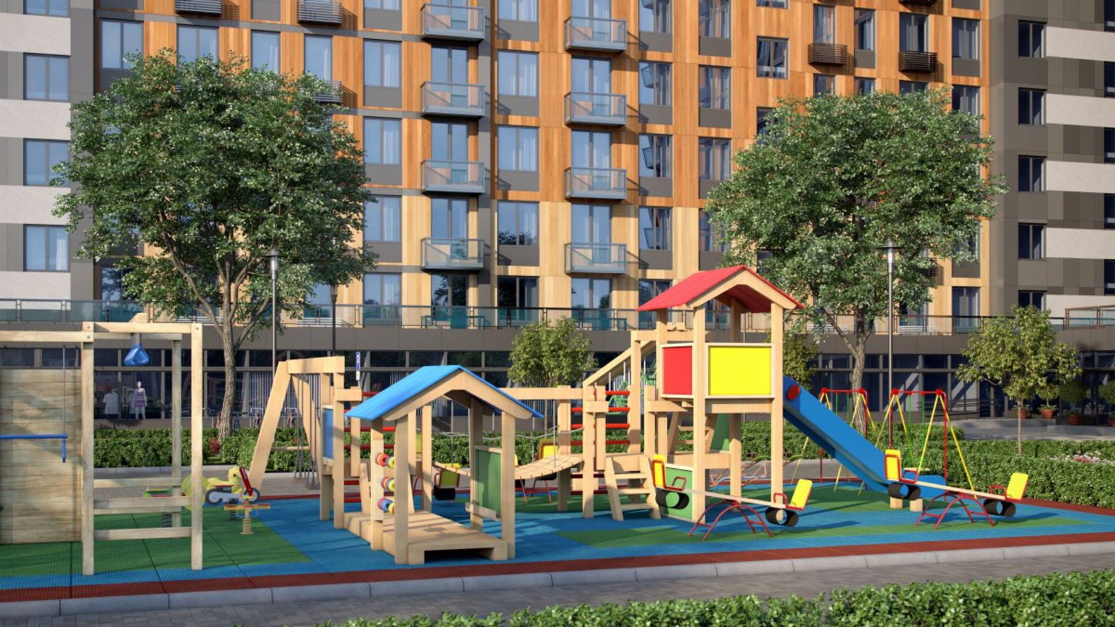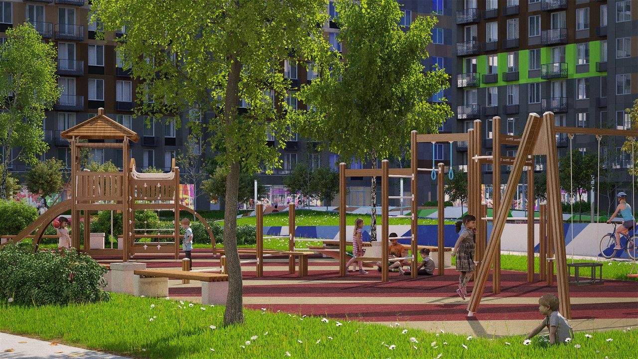 Комплекс оснастят всем, что только нужно для удобства и приятной жизни. Внутренние территории вместят не только стандартные наземные парковки, но и спортплощадки, зоны отдыха, а также детские площадки с игровым оборудованием.