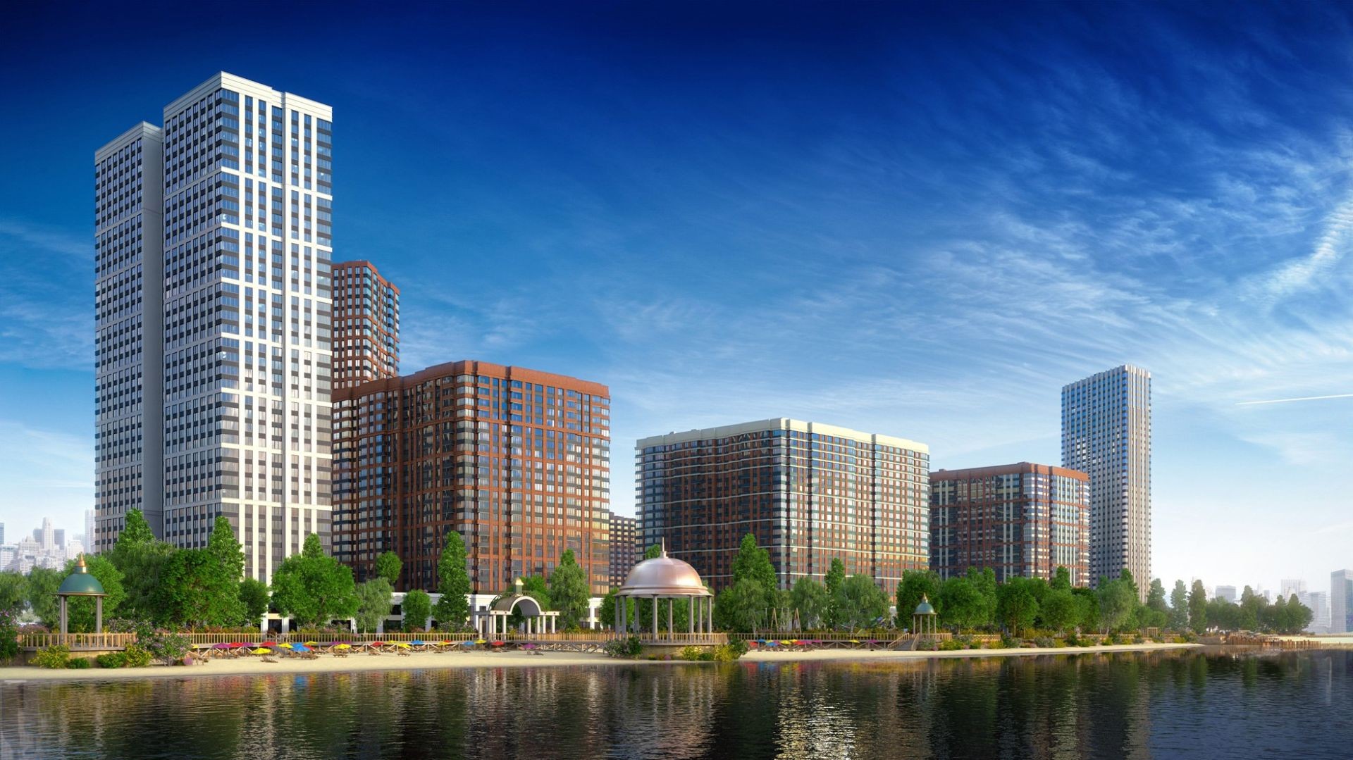 Согласно проекту, комплекс будет состоять из 9-ти жилых высокоэтажных (до 37 этажей) построек с квартирами 33-88 м2