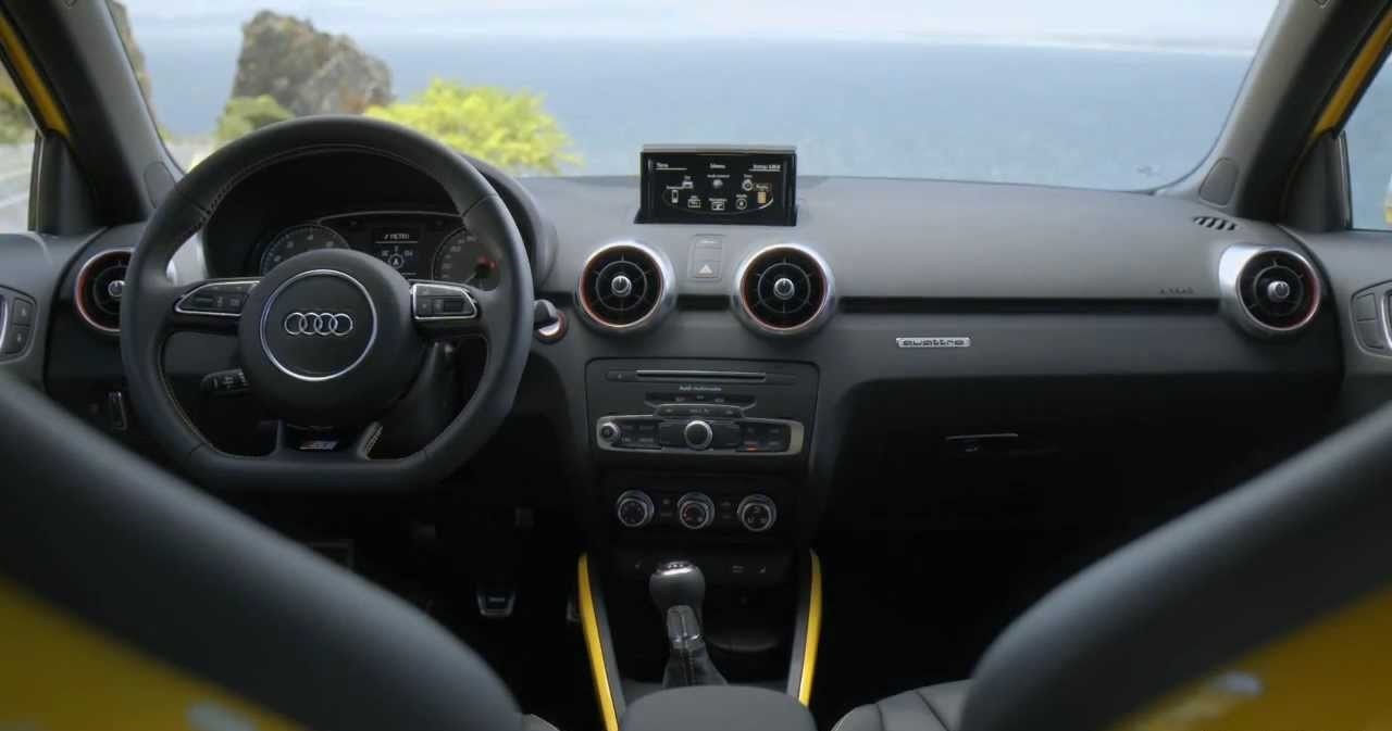 Как и всегда основная палитра цветов обновленного Audi S1 будет темной. Цвет рукавов вентиляционной системы – черный, тона шкалы приборов — оригинальные темно-серые. Педали спорткара шлифованные, покрытые нержавейкой.