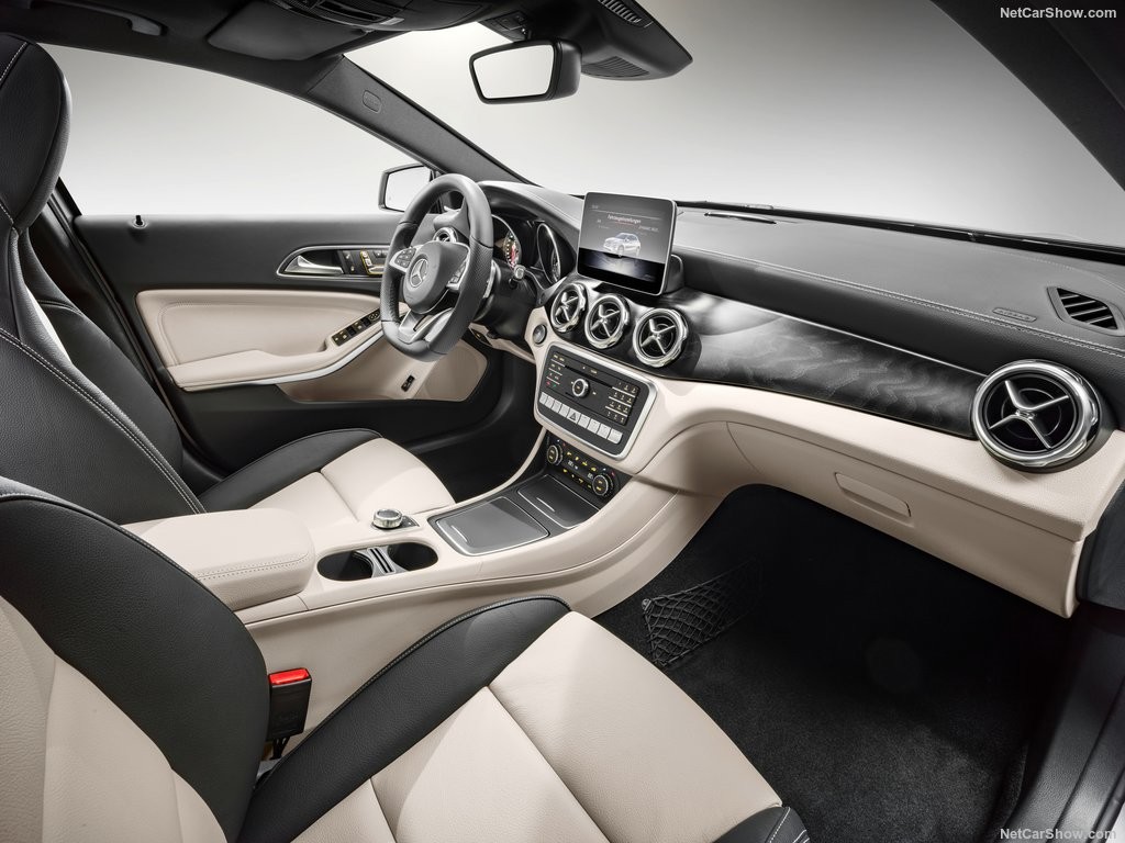 Передние кресла, как обычно, имеют повышенную комфортность. В базе в качестве обивки применена искусственная замша. Этот же материал применен и для отделки рулевого колеса. Характерная особенность отделки интерьера GLA — логотипы тюнинговых ателье на передних сидениях, плюс акцент на желтые тона в окраске.