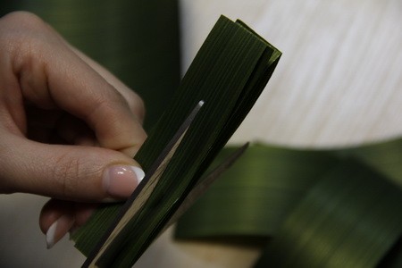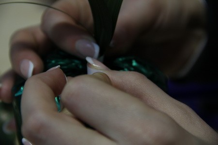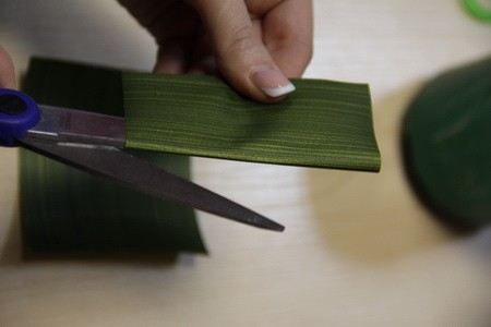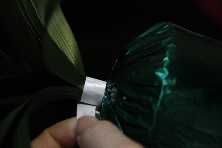 - Шаг 2. Из декоративной ленты вырезаем листочки, делаем из них пучок, и скотчем крепим их к оставленному нами хвостику.