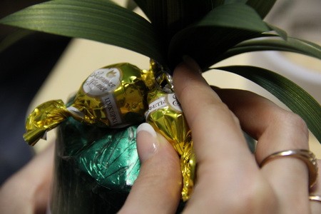 - Шаг 3. Используя клеевой пистолет или же двусторонний скотч, приклеиваем конфеты. Клеить их нужно поднимаясь от основания листьев. К тому же размещать их нужно довольно плотно друг к дружке.