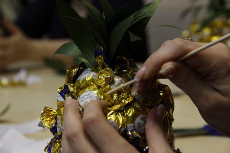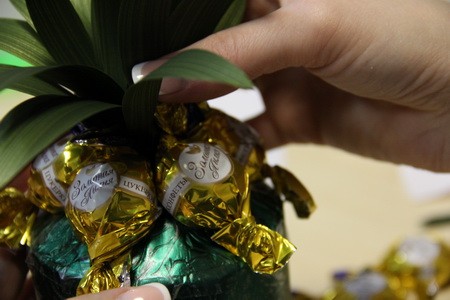 - Шаг 4. После того, как все конфеты будут приклеены на свои места, и клей немного подсохнет, нужно используя шпажку очень аккуратно выровнять все хвостики конфет, спрятав их внутрь промежутков, чтобы они не выдавались наружу. Всё! Наш ананас сделан и готов к роли праздничного подарка.
