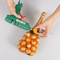 - Шаг 2. Используя клеевой пистолет, крепим конфеты к бутылке для шампанского. Обклеиваем её всю снизу до верхушки горлышка. А вот само горлышко не заклеиваем.
