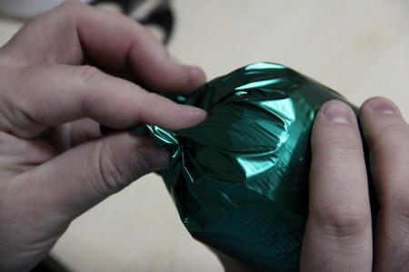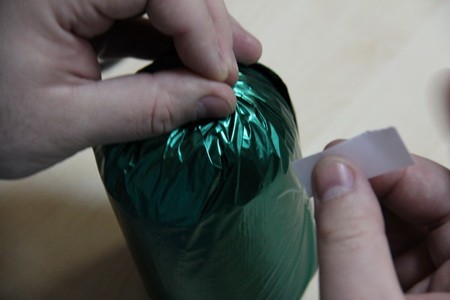 - Шаг 1. Овальную пенопластовую основу обматываем подарочной плёнкой, так чтобы оно с виду стало похожим на конфету, произведя крепление сверху тонкой проволочкой, так, чтобы образовался хвостик. Нижнюю и боковые части крепим скотчем.