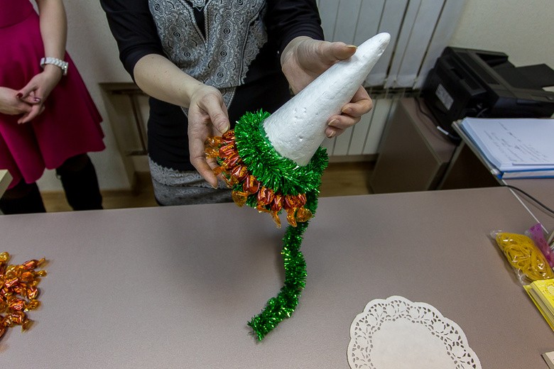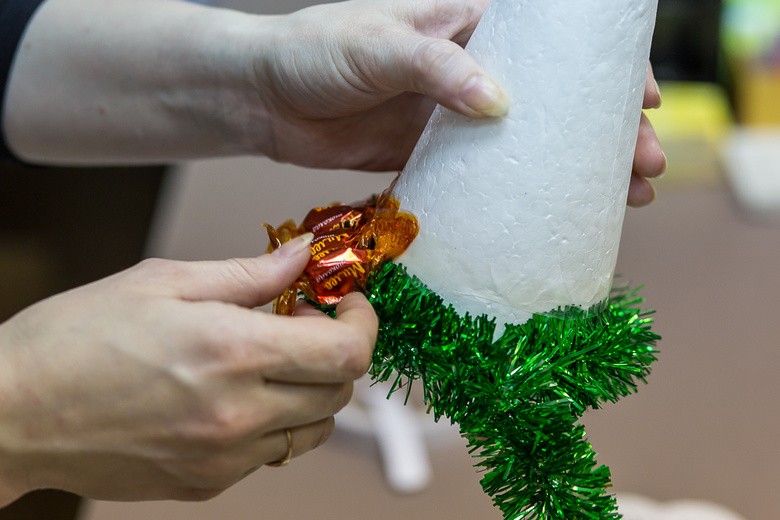 - Шаг 3. Второй ряд декора ёлки делаем из конфет. Они крепятся двусторонним скотчем либо же клеем, наносимым при помощи пистолета.