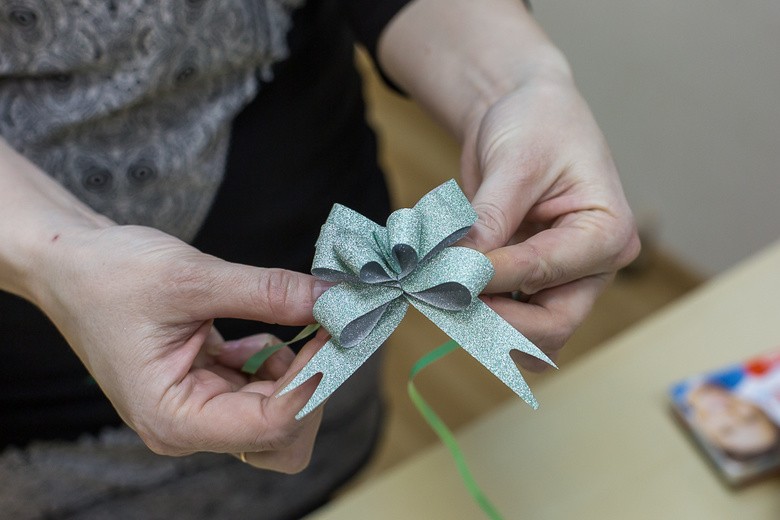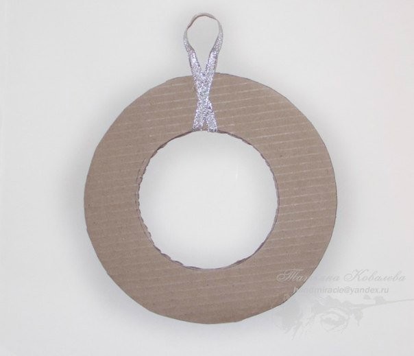 - Шаг 2. Теперь закрепим проволоку на круге и сделаем петельку таким образом, чтобы в дальнейшем нашу поделку можно было подержать, или же куда-нибудь подвесить. Украсим её бантом, сформированным из атласной ленты.